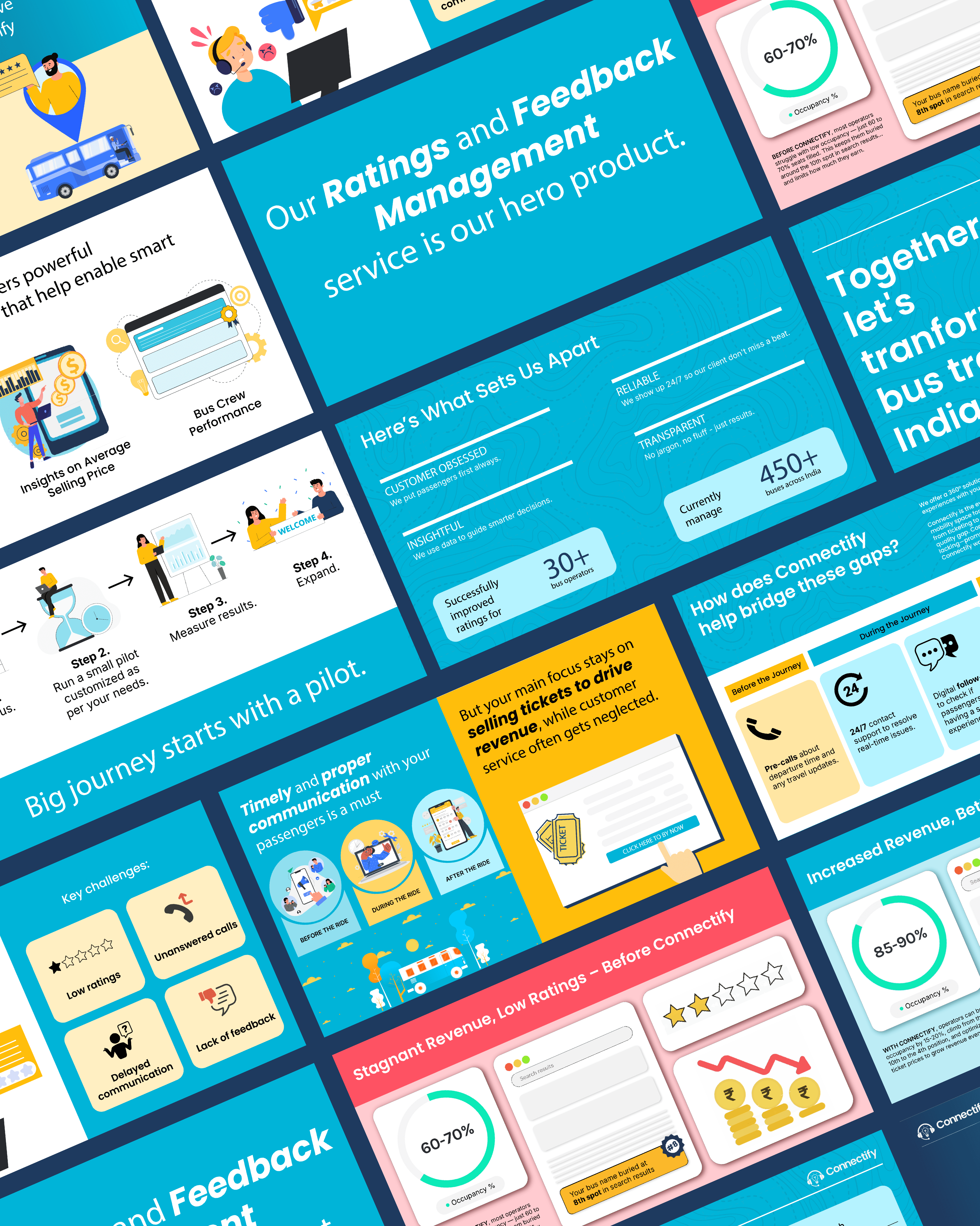 Connectify is a customer feedback and engagement platform for India’s intercity bus operators. They wanted to be seen as a trusted partner who helps operators climb search rankings through better ratings and passenger feedback.We designed a brand and communication system that tackled this challenge head-on. By blending humor, storytelling, and operator-first messaging, we positioned Connectify as the friend who ensures every trip turns into stars, visibility, and higher revenue. The design concept centered around clarity, relatability, and trust, making complex industry problems feel simple and solvable.