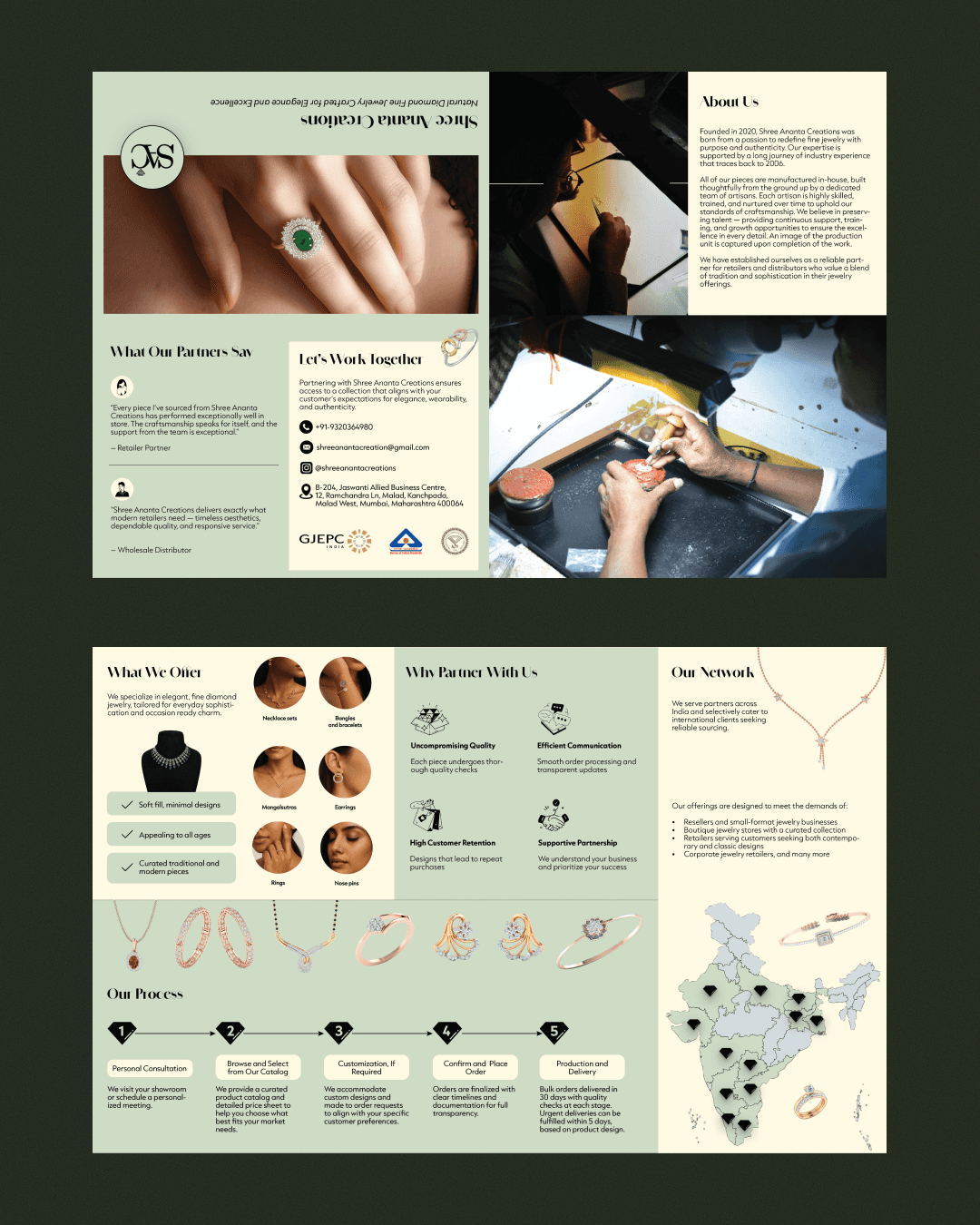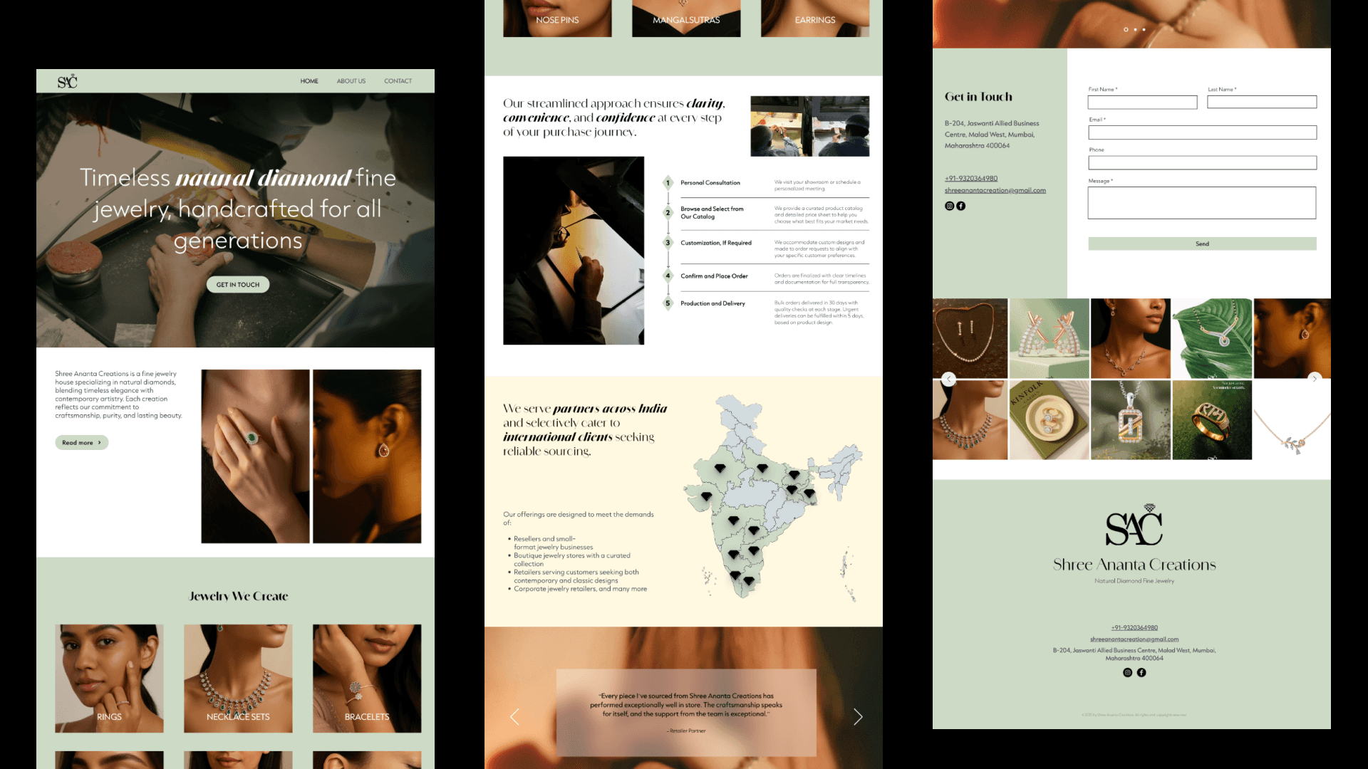 Shree Ananta Creations (SAC) is a fine jewelry manufacturer specializing in natural diamond jewelry with intricate designs crafted for generations. While their work spoke volumes of artistry and heritage, their brand presence lacked the digital narrative to match the brilliance of their creations.Our studio partnered with SAC to build a clean, minimal, and modern identity — from website design to social media storytelling. The goal was to highlight their craftsmanship, timeless jewelry, and strong retailer relationships while creating an approachable and aspirational digital face for the brand. Through thoughtfully designed visuals and content, we helped position SAC as not just a jewelry manufacturer, but as a trusted creator of elegance that inspires confidence in global markets.